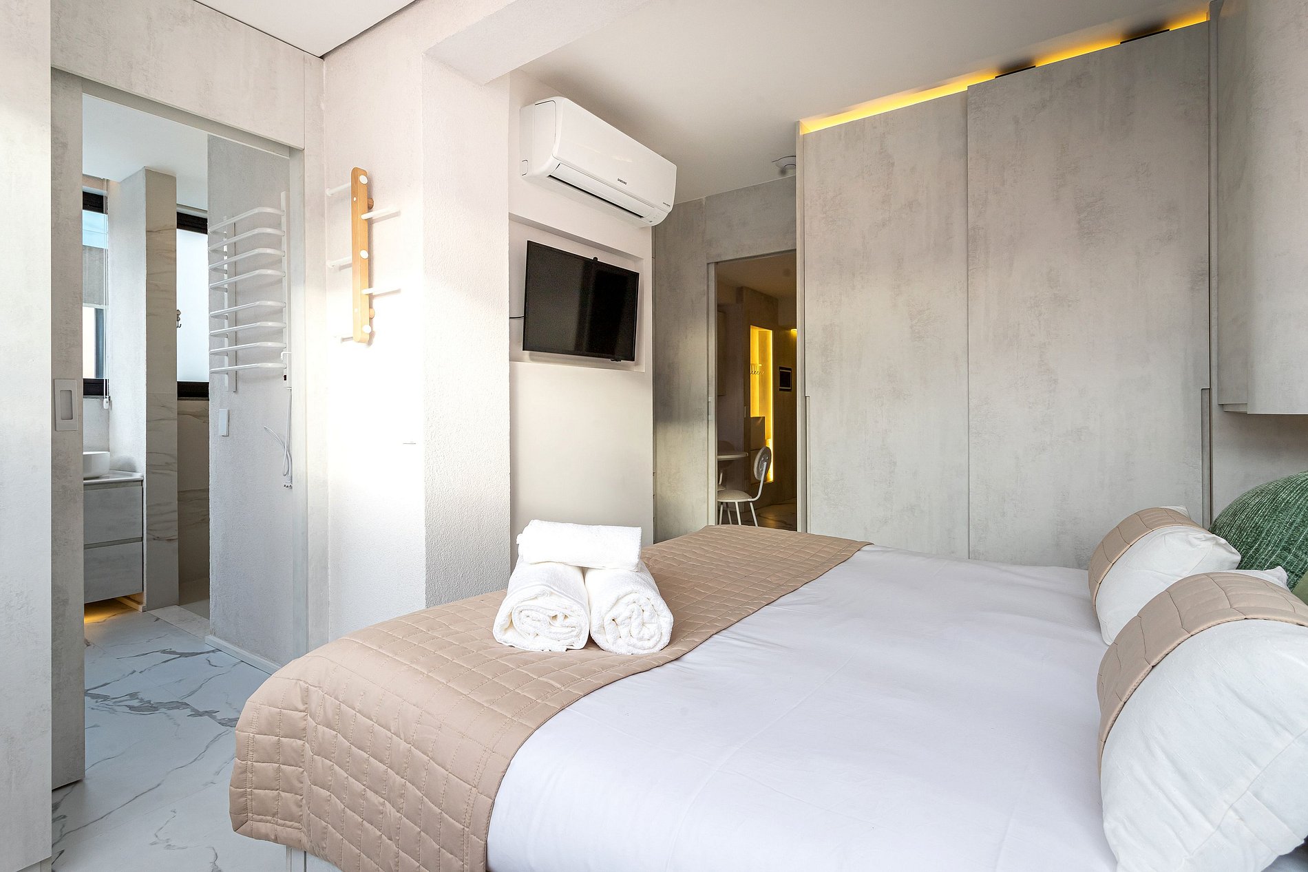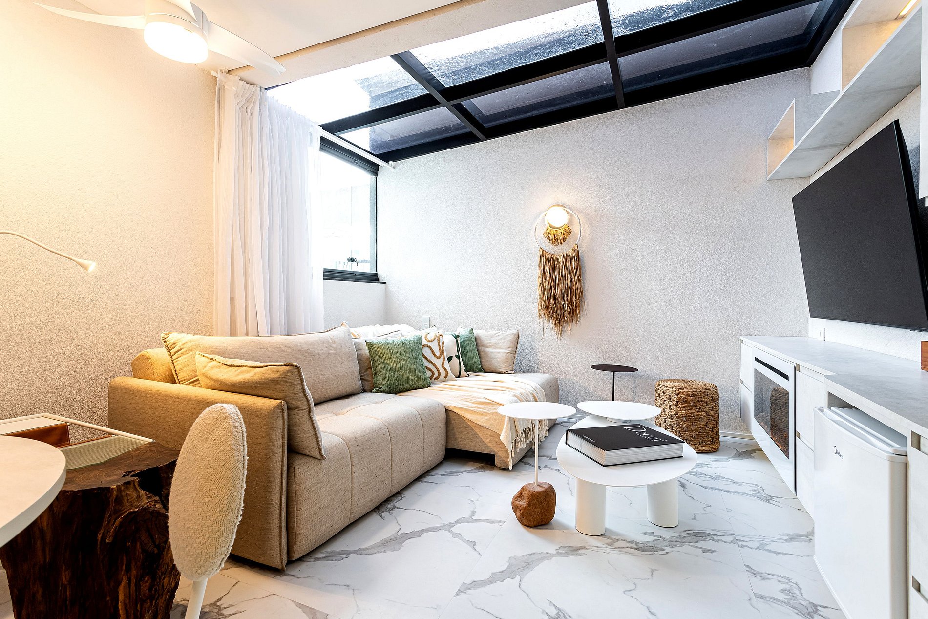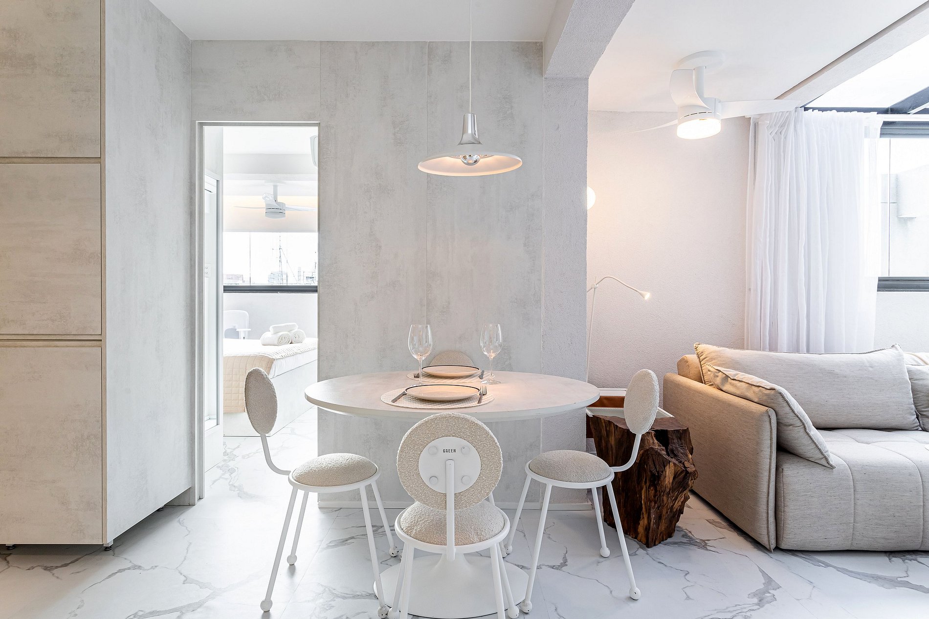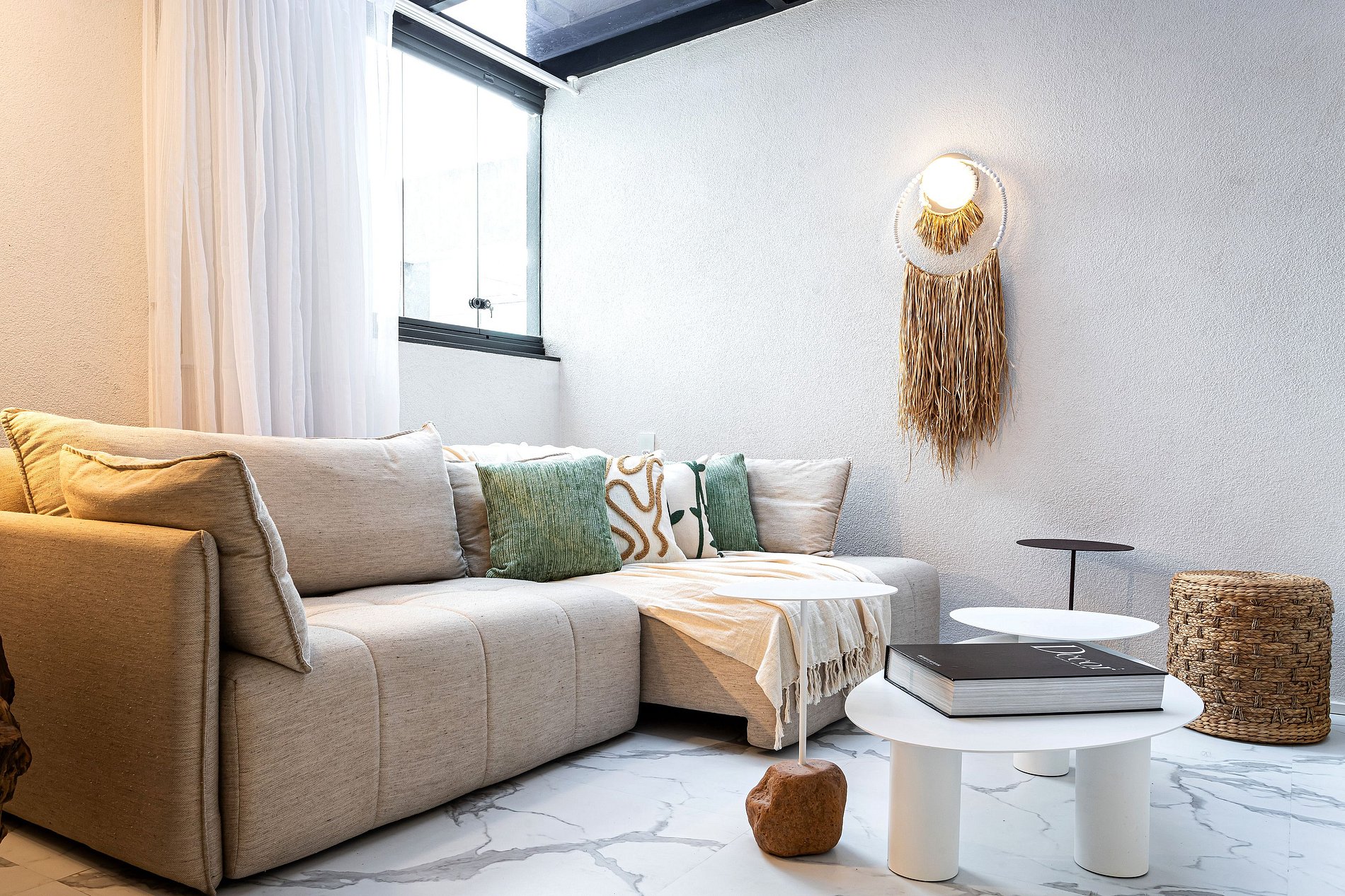 Lindo apartamento com Design sofisticado e luminoso, minimalista e contemporâneo, dominado por uma paleta de cores claras e neutras.