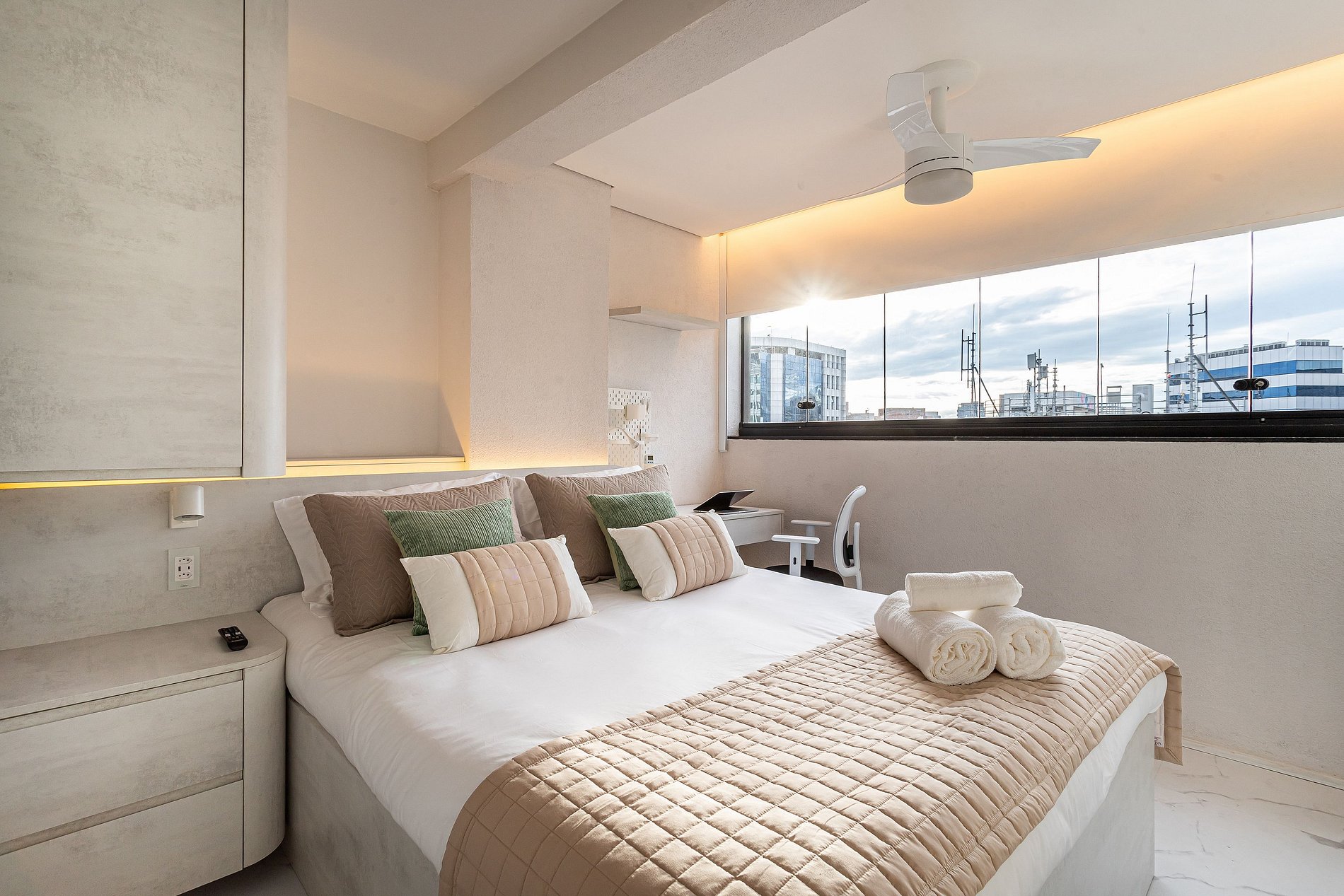 - O condomínio ainda conta com piscina, academia, lavanderia, espaço de co-working, sauna e mini-mercado.