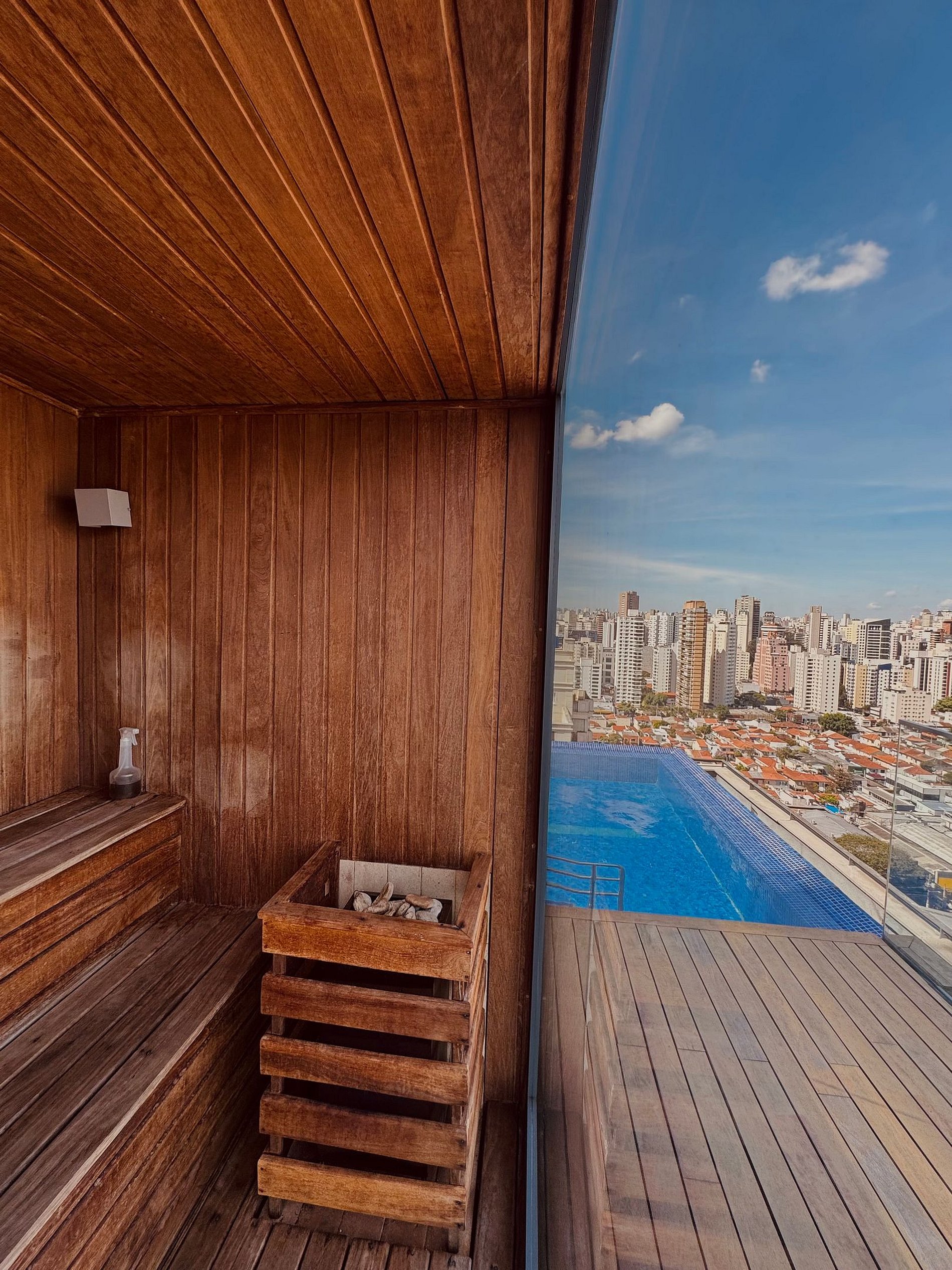 É possível usufruir da piscina com raia, jacuzzi, sauna envidraçada e solarium na cobertura, academia completa com pé direito duplo, vista panorâmica no 6º andar, quadra de squash e lavanderia comunitária térreo. Há ainda um espaço no mezanino que abriga um salão de jogos, deck com lounge.